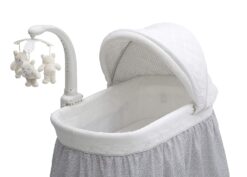 As beautiful as it is practical, the Deluxe Gliding Bassinet from Delta Children will lull your little one to sleep with soothing music, a soft nightlight and an electronic mobile accented with three plush bears.