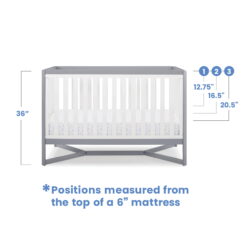 - ADJUSTABLE HEIGHT: Adjustable height mattress support with 3 convenient positions to grow with your baby | Access Rail Dimensions: 36″ from Floor to top of rail – 26.5″ from Lowest mattress support position to top of rail – 18.75″ from Highest mattress support position to top of rail