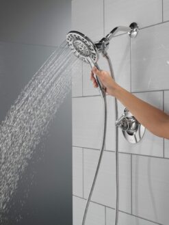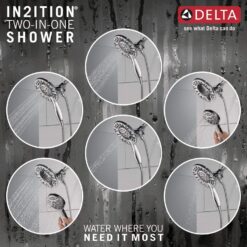 The fluid lines of the Arvoâ„¢ Bath Collection bring a delicate, serene look to the bath. The Delta® In2ition® Two-in-One Shower features a detachable hand shower which can be used separately from or simultaneously with the shower head. This integrated dual-functionality gives you maximum flexibility without sacrificing warmth, as you can choose to have water streaming from the shower head only, the hand shower only or both the shower head and hand shower at once. While other products may gather unsightly mineral build-up over time, Delta soft rubber Touch-Clean® spray holes allow any mineral residue to simply be wiped away for an instantly refreshed look – with no need for soaking or the aid of chemical cleaners. The pause setting gives you ample space for shaving, lathering and other shower tasks, then easily restarts the water with the temperature where you left off. This spray setting helps you conserve water, so you can worry less about depleting your supply of hot water – and you help the environment too. Delta WaterSense labeled faucets, showers and toilets use at least 20% less water than the industry standard—saving you money without compromising performance.