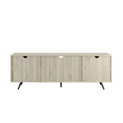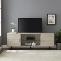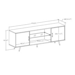 Display your great taste with the Desert Fields Thea Mid-Century Two-Door TV Stand. The angled legs and modern silhouette show guests a mature, retro aesthetic that complements any home decor. The center’s open storage provides a place to display family photos or place gaming consoles and the top will accommodate TV’s up to 80″. The two side doors with metal hinges each hide an adjustable shelf for speakers and movies. Made from warp-resistant MDF, durable laminate, tempered glass, and powder-coated steel, this entertainment stand will be a long-lasting addition to your home. Complete the look of your room with the Desert Fields Thea Mid-Century Two-Door TV Stand.