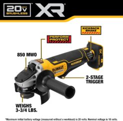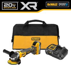 This brushless small angle grinder requires no time changing brushes, and offers a longer motor life. It offers a high level of protection. Its break stops the wheel in 2 seconds or less. The Kickback Break engages maximum force to stop the wheel when there is a pinch, stall, or bind-up to reduce kickback. The grinder will also shut off in those events to further protect the user. This kit includes our most powerful battery in its class, the 20V MAX DEWALT POWERSTACKâ„¢ 5.0 Ah battery utilizing revolutionary pouch cell technology to deliver 50% more power, 50% more work per charge, and 2X the lifespan. The DEWALT DCBP520 is compatible with all 20V MAX tools and chargers.
