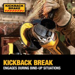 - KICKBACK BRAKE engages when a pinch, stall, or bind-up event is sensed and the electronic brake engages with maximum force to quickly stop the wheel, reduce the movment of the grinder and shut the grinder off