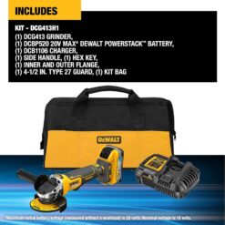 | Included Components | ‎DCG413 20V MAX* XR Brushless 4-1/2 in. Small Angle Grinder; DCBP520 DEWALT POWERSTACK 5.0 Ah Battery; DCB1106 Charger; Kit Bag; Side Handle; Hex Key; Inner and Outer Flange; 4-1/2 in. Type 27 guard |