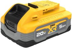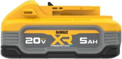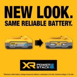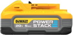 Our most powerful battery in its class, the 20V MAX* XR POWERSTACK 5.0 Ah Battery utilizes revolutionary pouch cell technology to deliver 50% more power, 50% more work per charge, and 2X the lifespan. Compatible with all DEWALT 20V MAX* tools and chargers, the XR POWERSTACK 5.0 Ah Battery features an impact-resistant, rubber overmolded base and includes 3-LED Fuel Gauge state of charge indicator.