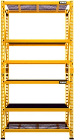The DEWALT DXST4500-W 4-Foot Tall, 3 Shelf Steel Wire Deck Industrial Rack was designed and engineered to provide heavy-duty, professional level storage. The three industrial metal wire grids can each support an evenly distributed 1,500 lb. for a total of 4,500 lb. The uprights, crossbeams, and support straps are all made from powder-coated steel and are designed so that once assembled, each shelf has two types of support straps in addition to the crossbeams to prevent them from buckling under pressure. Glass-filled nylon feet on the uprights protect the powder coat from damage when repositioning the rack in addition to providing a second layer of protection against unwanted moisture and liquid spills while also protecting finished flooring from damage. Additional safety features include locking grid clips to secure the wire grids into place and a wall mount bracket so you can secure your rack in place to prevent any accidental tipping. Each rack also includes 2 stacking plates so you can easily join multiple racks together to create a complete storage or workspace solution customized for your needs. For easy assembly, the rack hardware kit includes a wrench, hex key, and hex driver bit and two of the four uprights come with pre-installed horizontal and diagonal support beams. MULTIPLE SUPPORT STRAPS – Each shelf features a total of 5 support straps to prevent twisting or spreading under heavy loads NYLON FOOT PADS – Rugged glass-filled nylon feet protect powder coat from damage and also prevent damage to flooring SAFETY FEATURES – Locking pins secure crossbeams and wall mounting anchor bracket prevents accidental tipping LARGE STORAGE SURFACE – Shelf decks measure 44.25-inches x 17.5-inches to provide ample space to store tools and parts2.35-INCH INCREMENTS – Shelves are adjustable in 2.35-inch increments for custom storage sizing EXPANDABLE – Join multiple racks together vertically or horizontally to create a complete storage or workspace solution