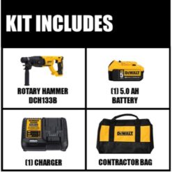 The DCH133B 20-Volt MAX XR Brushless 1 in. D-Handle Rotary Hammer is a compact light weight high-performance rotary hammer that has a durable German engineered mechanism that delivers 2.6 joules of impact energy. At the heart of this tool is the DEWALT brushless motor and durable rotary hammer mechanism. With its better than corded speed of application, compact size, light weight and balanced design, this hammer can replace your corded tool. The mechanical clutch enhances user control in a bind up situation and can help minimize sudden torque reaction. The DCH133 is dust extraction ready for the D25301D. The DEWALT DCB205CK kit keeps your power tools running and productive. This kit includes a 5 Ah 20-Volt MAX battery pack, charger and kit bag. The battery and charger are compatible with the entire line of DEWALT 20-Volt MAX Tools and accessories.