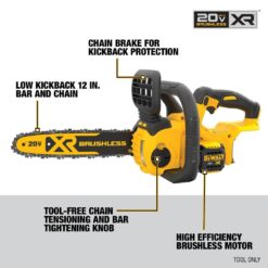 The DEWALT DCCS620B 20-Volt MAX batteries. Gas-free operation eliminates the cold starts, fumes, carburetor issues and maintenance involved with gas-powered chainsaws. This battery powered chainsaw is built to work hard. Use it for tough construction and outdoor jobs like cutting beams, demolition work and managing tree limbs. The lightweight design maximizes user control. Brushless motor technology delivers extreme runtime and long motor life. The DEWALT 20 Pruner DCPR320B features a 1.5 in. cutting capacity allowing you to cut the same size branches as you would with larger manual loppers in the compact size of a 1-handed compact tool.