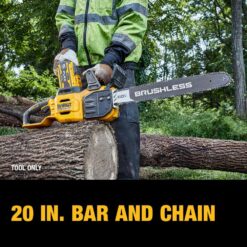 The DEWALT 20 in. 60-Volt MAX Chainsaw features a 20 in. bar and chain, allowing the same cutting capacity as a gas saw. It features a high-efficiency brushless motor to deliver fast and powerful cuts for tackling heavy-duty jobs. The 4.0 Horsepower motor provides equivalent power to a 50.2 cc gas engine. The Chainsaw also has tooled chain tensioning for reliable bar retention.