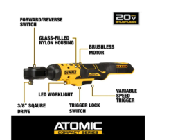 Get the performance and versatility you need to complete challenging fastening work with this DEWALT DCF513B ATOMIC (TM) 20V MAX* Brushless Cordless 3/8 in. Ratchet.
