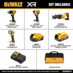 This 20V MAX* XR® Brushless Cordless Combo Kit includes 4 tools, two 20V MAX* batteries, charger, and kit bag. The DCD805, 1/2-in Drill/Driver is designed to help you complete demanding fastening and drilling projects, this 20V MAX* XR® Brushless 1/2-in Hammer Drill/Driver delivers the durability and performance professionals need on jobsite. Quickly drive fasteners into thick material with its powerful brushless motor, which outputs up to 40% more Unit Watts Out compared to DCD796B using DCB205 battery or DCBP034 DEWALT® POWERSTACK™ compact battery. DCD805 will help you Speed through masonry drilling applications with up to 34,000 bpm thanks to an integrated hammer mode function. Both Tools are equipped with LED lights for better visibility, The 3-position pivoting LED on the Drill Driver is designed to enhance visibility in dimly lit work areas with its 3 mode settings and up to 70 Lumens of brightness. The 1/4-in Brushless Cordless 3-Speed Impact Driver Compact size (5.3-in front-to-back length) and lightweight (3.4 lb) design for working in confined spaces. Though the Impact Driver is lightweight and compact in size, it does not sacrifice performance with its brushless motor that delivers up to 1,825 in-lb of torque and 3,250 rpm for driving large-diameter screws. The DCS382 Reciprocating Saw has a stroke length of 1-1/8-in and a variable-speed trigger delivering up to 2,900 strokes per min helping you cut through any job. The DCL040 LED Work Light has a bright output of up to 110 lumens to illuminate your work surface. This kit is backed by a 3-year, limited warranty so you can buy with confidence. This cordless kit includes one of our most powerful, most compact, and lightest weight 20V MAX* battery, with 50% more power, 25% more compact, and 15% less weight than the DCB203. The DEWALT® POWERSTACK™ compact battery works with all DEWALT® 20V MAX* power tools and chargers.