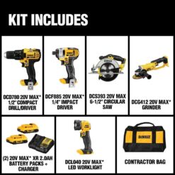 The DEWALT DCK521D2 Combo kit is ideal for most fastening, cutting and grinding applications. This kit includes a DCD780 drill/driver, DCF885 impact driver, DCS393B circ saw, DCG412B grinder and DCL040 light. This kit also includes two 2.0 Ahr Batteries, charger and a contractor bag for portability.