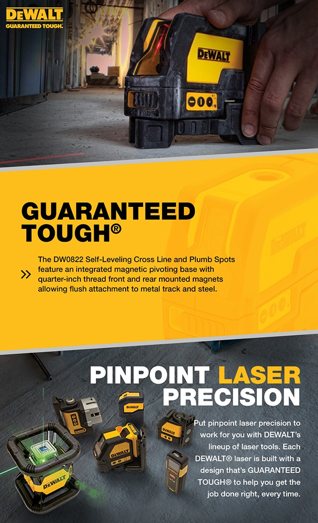 The DEWALT Self Leveling Cross Line and Plumb Spots Laser Level projects two bright, self-leveling horizontal and vertical beams to provide accurate plumb point transfer. Down-beam projection with raised clearance provides laser-dot visibility and alignment for wall track layout. The beams have an indoor visibility of 100 ft. The range of this handy leveling instrument can be extended to 165 ft. with a separately sold DEWALT laser detector. It’s designed to withstand hazardous job site conditions thanks to an overmolded housing that protects the unit from precipitation and construction debris.