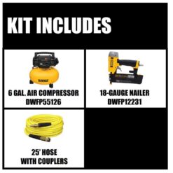 The DEWALT DWFP55126 6 Gal. Air Compressor is designed with a high efficiency motor for easy start up in cold weather or extension cord applications. This compressor has 2 universal couplers to easily support 2 users. The DWFP55126 features a long life oil-free pump for maintenance-free operation. The DEWALT dwfp12231 18-Gauge brad nailer is designed with a long-life, maintenance-free motor to keep from staining the work surface. The DEWALT 50 ft. Air Hose DWFP1450D is designed to withstand the rigors of your job site.