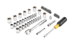 This 53-Piece Mechanics Tool Set includes a wide selection of sockets, socket accessories and driver bits to help complete a variety of tasks. The set is sold inside the 2 large organizer cups within TOUGHSYSTEM 2.0 22 in. Small Tool Box. This set includes a durable 72-tooth ratchet with 5° arc swing for maneuverability in restricted areas. Full-polish chrome provides corrosion resistance and gives these tools a classic look.