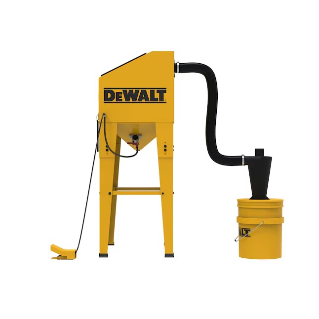 DeWalt Abrasive Blast Cabinet (DXCM009-0370) is ideal for removing rust or paint from automotive parts & other equipment. This unit features a hood style door for easy loading & unloading, adjustable leg heights, a foot operated gun, a media vibrator for consistent flow, and a cyclone for dust management (bucket with lid for cyclone not included). The Blast Cabinet also has a 125 PSI max working pressure with an average consumption of 20 CFM @ 90 PSI. 40 lb media capacity.