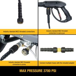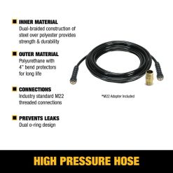 DEWALT hose technology is designed to be highly flexible and kink resistant. Our hose has a polyurethane outer jacket that is non-marring and abrasion-resistant for improved durability; the 4-inch bend protectors on each end of the hose help extend the life of the hose. This is a cold water hose that is equipped with industry-standard M22 threaded connections with a dual o-ring design to fit most gas and electric pressure washers up to 3700 PSI.