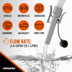 - CONVENIENT BATTERY-POWERED FUEL TRANSFER PUMP | Portable Deway Gas Transfer Pump Helps You Transfer Gasoline, Kerosene, Diesel Fuel, Non-Potable Water & Other Liquids Without the Dangerous Mess or Heavy Lifting! Easy-to-Operate System Features an Auto-Shutoff Nozzle, On/Off Button Controls, Extended 51” Discharge Hose, Durable 19” Intake Tube & Easy [4 AA] Battery Operation That Powers Your Pump Up to 100 Gallons
