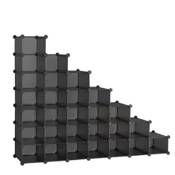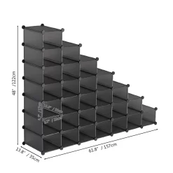 Purchased this unique 28-slot shoe rack to get my Chuck Taylor’s off the floor. The package arrived quickly and the assembly process was quite straight forward. The materials used are plenty strong enough for the shoes and I foresee no issues with the lifetime of the product. The flexibility of design is a great feature. I will be purchasing another set for my wife, and with that one, I’ll be leaving some slots open for taller boots. As can be seen by the photo, I can put my shoes in side-by-side (not having to put on top of each other, or sideways) in the slots. Additionally, I could put 7 additional pairs on top of the top slots (where I have my hats), so I could really have 35 shoes in this one shoe rack. Note: Pushing the components together until you hear the click is key. As stated in the instructions, push together again ones you have the row complete (you may hear additional clicks).