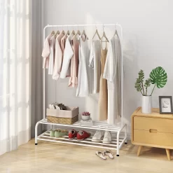 Bottom shelf gives the clothing rack added strength and stability, also provides off-the-floor space for shoes, boots, baskets and bags, umbrellas