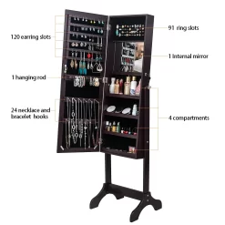 2. The storage space is large and the storage structure is diverse. There are 120 ear ring grooves, a bracelet bar and 24 necklace hooks on the left side of the cabinet, while 91 ring grooves, an inner mirror and 4 layers of shelves on the right side. The spacious wardrobe can easily organize and keep all your jewelry in good condition.