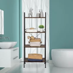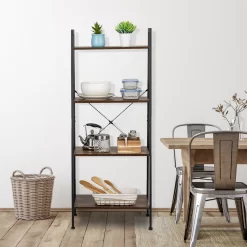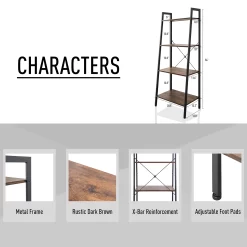 Ladder Shelf, 4 Tier Industrial Leaning Bookshelf, Metal Bookshelves Standing for Room, Office, Living Room, Bedroom, Farmhouse Rustic Tall Bookcase Organizer, Vintage Brown