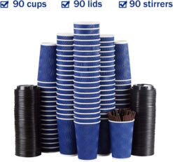 Disposable Coffee Cups with Lids and Straws – 16 oz (90 Set) Togo Hot Paper Coffee Cup with Lid To Go for Hot/Cold Beverages Espresso Tea Insulated Reusable Cold Drinks Ripple Cups Protect Fingers!