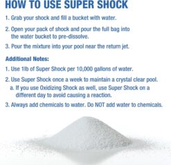 - How to Use: Use one 1lb bag of Super Shock per 10,000 gallons of water. Spring openings and pools that have extensive algae blooms may require 2-3 doses to properly treat and sanitize