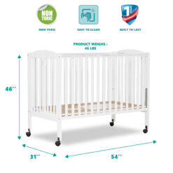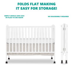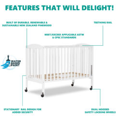 The Dream On Me 2-in-1 Crib offers ultimate convenience for a growing family. When your little one graduates from the crib, simply remove the mattress, flatten it out using the patented folding system and store it away for later use. When entertaining friends with infants and toddlers, you can re-use the full-size portable crib again by simply unfolding it and locking it back in place. It’s a breeze to set up in any room of your home. This crib blends nicely with most interiors, from traditional to contemporary. It features a stationary rail design and dual-safety hooded locking wheels, making it an excellent choice for your little one. The full-size folding crib is manufactured from durable birch with a non-toxic finish.