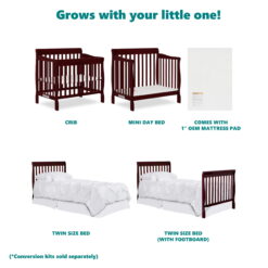 The Dream On Me Aden Convertible 4-in-1 mini crib is a beautifully designed crib that gracefully matures gracefully with your child from infancy, through childhood to adulthood. With its robust good looks and solid frame, this crib features a stationary (non-drop side) rail design which provides the utmost in product safety. For ease in reaching your baby, it sits low to the floor and features the convenience of a three-position, adjustable mattress support system. Stylish and sturdy, this lovely piece of nursery furniture grows with your child transitioning easily into a mini daybed, and twin size bed (twin size bed frame and twin mattress not included). Available in a variety of stylish finishes, coordinates with the Dream On Me Marcus changing table and dresser (sold separately).