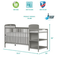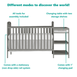 The Anna 3-In-1 Full Size Crib & Changing Table Combo is a stylish and functional investment that keeps pace with your child’s changing needs. Convert it from a crib to a toddler bed, and then a daybed (Toddler Guardrail/Stabilizer sold separately) as your child grows.The changing table with two storage shelves adds to the utility. The changing table is equipped with a custom fit 1” changing pad. There are two open storage shelves beneath the table, allowing you to keep baby essentials handy.The Anna features a sleek and modern design with clean lines. You can choose from six elegant finishes- Black, Cherry, Espresso, Natural, White & Storm Grey and match it effortlessly with any nursery theme! All Dream On Me cribs are tested to ensure all applicable ASTM, JPMA & CPSC standards are met. This Anna comes with a stationary (non-drop side) rail system for added safety. All tools for assembly are included, conversion kit sold separately. Choose any Dream On Me non-toxic, Greenguard certified standard crib mattress for the perfect fit. Maximum weight limit is 50 lbs.