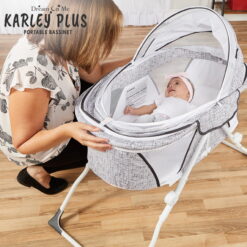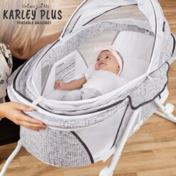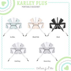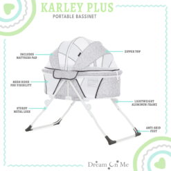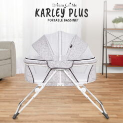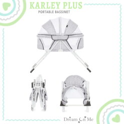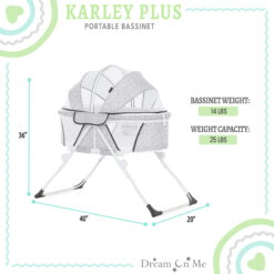 Dream On Me introducing Karley Plus! An upgrade to our most popular and multiple award winner Karley Bassinet, which is designed for portability and small spaces. This JPMA-certified bassinet is just the right size bassinet for your newborn’s first months. Weighing only 14 pounds, its lightweight design, compact and convenient frame with mattress pad provides restful sleep at home and away. Featuring a streamlined design with a firm, flat sleep surface and mesh side panels for reassuring visibility and breathability while the optional canopy adds design features for any situation – indoors or out. Its sturdy metal legs snap on in seconds for easy setup. This product is recommended for babies up to 25 lbs. or 6 months of age, or whenever your baby begins to show signs of pushing up to hands and knees. Let the Dream On Me Karley Plus comfort your baby all night long right by your side.