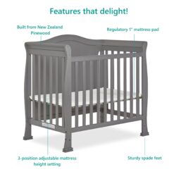 The Dream On Me Naples Mini Crib will add cheer to any baby’s nursery. The Contemporary style will add beauty and the convertible features add versatility. You can use this crib during your baby’s younger years then convert it to a day bed through toddlerhood and beyond using an optional conversion rail kit. This crib may be smaller in size, but it’s just as gorgeous and comfortable as a standard-size crib and is perfect for freeing up space in the nursery, using in smaller rooms, or at grandma’s house. This crib comes with a 1” mattress pad and is available in a range of finishes. All Dream On Me crib meets all applicable ASTM and CPSC standards