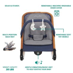 - MULTI-FUNCTIONAL: The 2-in-1 Stationery and rocking mode can be used in a stationary position or as rocker. The seat has a multi position backrest for maximum comfort for the baby. Hanging toy bar with 2 toys included for hands on fun during playtime and has a gentle Vibration/music unit to help sooth baby