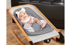 - MULTI-FUNCTIONAL: The 2-in-1 Stationery and rocking mode can be used in a stationary position or as rocker. The seat has a multi position backrest for maximum comfort for the baby. Hanging toy bar with 2 toys included for hands on fun during playtime and has a gentle Vibration/music unit to help sooth baby
