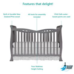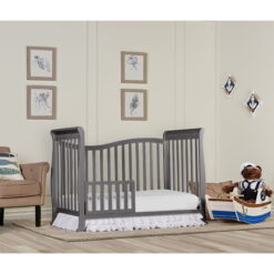 Designed with timeless appeal, the Violet 7 in 1 Crib from Dream On Me is built to grow with your child. It features a beautiful flowing design that will coordinate with a wide variety of decorative styles. This unique 7 in 1 crib can transition easily to a comfy toddler bed, daybed, youth bed, and full-size bed as your child grows. It is also equipped with an easy to use four position mattress support system for added adaptability. This crib is available in a range of finishes. All Dream On Me crib meets all applicable ASTM and CPSC standards.