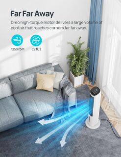 - Oscillating Fan with Cooling Wind: Powered by Dreo 1,500 rpm, along with the 80° wide angle oscillation, this personal swamp cooler blows cold air at up to 21.65 ft/s and covers far ends of your living space