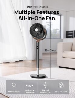 - One Fan, Multiple Functions: From circulating air around, to quiet powerful cooling, Dreo Poly Fan for bedroom combines a pedestal fan, an oscillating fan, and an air circulator into one, which adapts perfectly to all your needs. Don’t get confused by its shape, the 8 wind speeds and 3 modes of the Dreo standing fan do much more than a traditional fan.