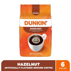 - Contains six (6) 18-ounce bag of Dunkin’ Hazelnut artificially flavored ground coffee