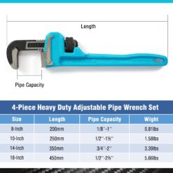 DURATECH 4-Piece Heavy Duty Pipe Wrench Set, 8″,10″, 14″, 18″, Adjustable Plumbing Wrench, Malleable Cast Iron Handle, Exceed GGG Standard