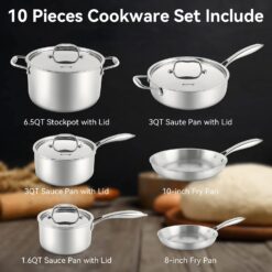 - EVEN HEATING: This kitchen cookware set is manufactured with whole-clad tri-ply stainless steel—ensuring even heating and eliminating hot spots. Suitable for all stovetops, such as induction, gas, electric and halogen cooktops