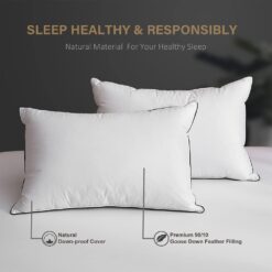 - Nighty Night Promises – The feather and down in this pillow is RDS approved, giving you the reassurance that it’s been responsibly-sourced with a high emphasis on their welfare. Crafted with OCS standard organic cotton, the hypoallergenic pillow is Natural, Breathable, Durable, Skin-friendly, Fluffy and Sustainable – which can provides special care for sensitive-skin people and allergy sufferers. Hooray!