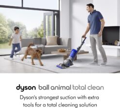 The Dyson Ball Animal Total Clean has the strongest suction of any vacuum.¹ It handles tough tasks easily, making it ideal for parents and pet-owners. It has an advanced self-adjusting cleaner head that automatically adjusts between carpets and hard floors – sealing in suction across all floors. Its wand and hose release in one smooth action to make it easier to clean up high and under furniture. Comes with eight Dyson-engineered accessories, including the tangle-free turbine tool, which removes hair from carpets and upholstery without tangling. With hygienic bin emptying, there’s no need to get your hands dirty – just push the button to release the dirt. Whole-machine filtration ensures that allergens and bacteria are trapped inside the machine, not expelled back into the home. Comes with a 5-year warranty and lifetime Dyson support. Register your machine on the MyDyson™ app for personalized machine guides, maintenance and support.