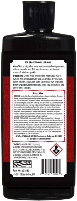 E.J. Wheaton Co. Glass Wax, Polishes and Protects Windows, Mirrors and Metal Surfaces, Dries Chalk White, Easy to Apply and to Remove, Made in USA. Professional Glass Wax is a liquefied paste wax formulated with premium carnauba wax. This easy to use wax applies and comes off widows, mirrors and metal surfaces quickly. Glass Wax polishes and protects windows, mirrors and metal surfaces.