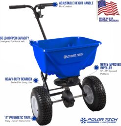 EarthWay 90365 Polar Tech 65 LB (29 KG) Professional Ice Melt Broadcast Walk Behind Spreader with 13″ Pneumatic Tires, Adjustable Handle, and Solid Linkage Control