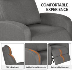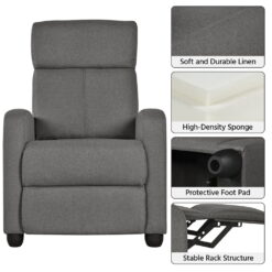 The upholstered reclining sofa features a soft-cushioned seat supported by pocket springs, extra thick foam, and a rayon fiber filled backrest and footrest. Covered with strong yet soft linen fabric, the excellent texture gives you the ultimate sitting experience. You can enjoy your favorite seating positions on this adjustable reclining chair. If you prefer sitting up straight or with your legs up or lying flat, you can simply push at the backrest to adjust. The footrest instantly pops up and stops at any angle between 0 and 90 degrees. This fabric reclining chair works for the living room, office, and bedroom. It is a perfect spot to spend leisure time watching games, movies, TV dramas and music. This single recliner chair sits on four sturdy feet equipped with non-marking pads, which protects both the sofa and the floor.