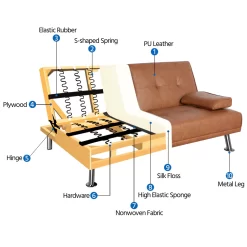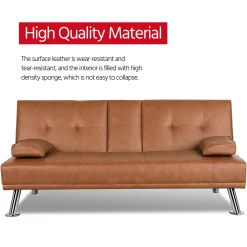 Easyfashion LuxuryGoods Modern Faux Leather Futon with Cupholders and Pillows, Brown