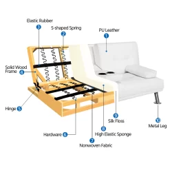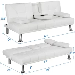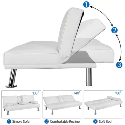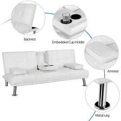 Easyfashion LuxuryGoods Modern Faux Leather Futon with Cupholders and Pillows, White