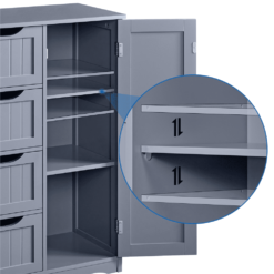 If extra toiletries and spare towels are piled up in your bathroom ensemble, having a spacious storage cabinet can help you hide all the clutter behind the door and out of sight. This 22” L x 12” W x 32.5” H cabinet has 4 no-handle sliding drawers and 1 roomy cupboard with an adjustable shelf. Once you have it, the storage space in your bathroom, kitchen, sitting room will be instantly expanded. Its clean-lined design with slatted paneling works well in a variety of aesthetics. After assembly, the dimensions are 22 x 12 x 32.5” (LxWxH).