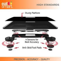 The Eat Smart Precision 550 tops the charts with its extra high 550 lb. capacity, the highest capacity in the market. The generous 15” x 13” platform is highlighted by black stainless steel placed on a silver glass base, easily accommodates all foot sizes, provides comfort and stability, and is sturdily constructed. Four precision sensors and proprietary step-on technology ensure instant and accurate measurements in 0.2 lb. or 0.1 kg increments, eliminating the need to tap on the scale and wait for it to calibrate before stepping on. Once your weight has been taken, the scale will beep three times and hold your reading on the 3″ x 2.25″ bold black with bright white digits display, allowing extra time for you to step off the scale and view your weight. After several seconds, the scale’s auto off feature will activate to power off the scale and conserve battery power. Backed by the EatSmart 100. Please contact us for help or troubleshooting your scale.