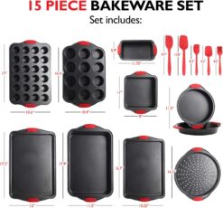 - 15-Piece Bakeware Set: The 15-Piece Baking Pan Set offers a complete durable nonstick bakeware set. Includes baking pan, pizza pan, small cookie sheet, 2 round pans, square pan, loaf pan, big cookie sheet, 12 & 24 cup muffin pans, and 5 silicone spatulas.